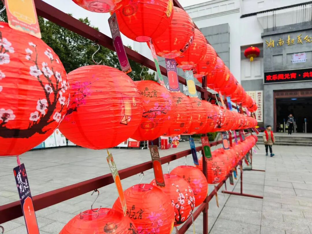 在每盏灯笼下都藏着趣味灯谜。猜出谜底后,可直接取下灯笼到纪念馆序厅核对,答对就能抱走中秋纪念品。